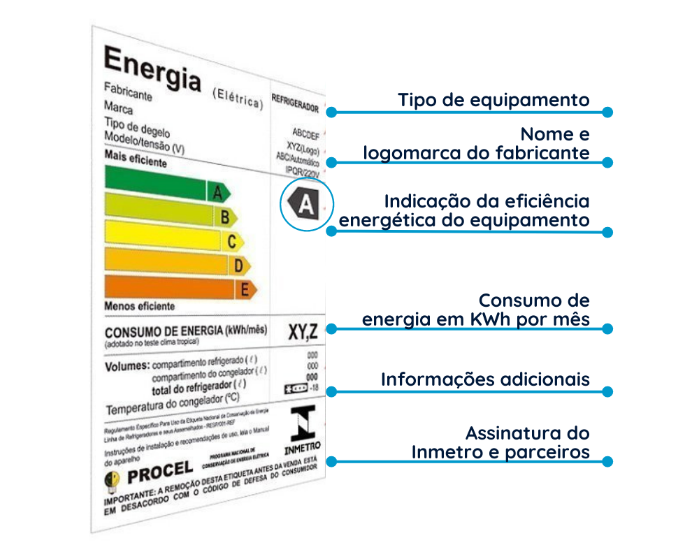 O selo é composto basicamente por oito tipos de indicações, as quais vamos detalhar ao longo deste texto, porém a principal é a indicação de eficiência energética, que é classificada por letras sendo a letra “A” o mais alto nível de eficiência do equipamento, sempre na cor verde. As demais letras que seguem abaixo alternando suas cores em uma escala que sai do verde até a cor de abóbora ou vermelho, exemplificando que as últimas escalas e de cores mais quentes são as menos eficientes.