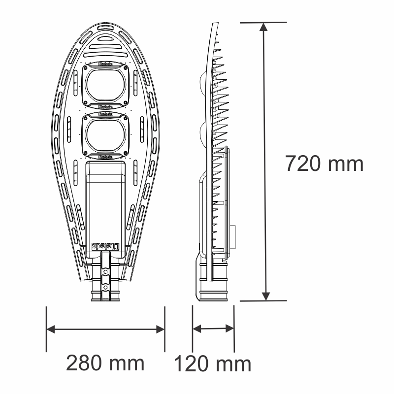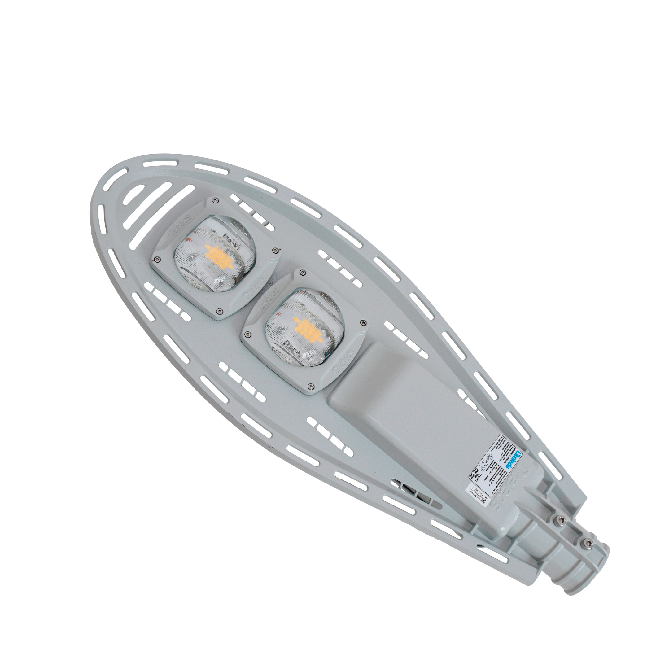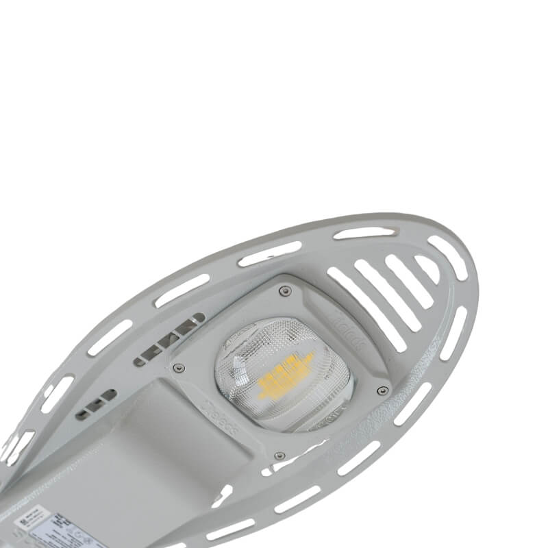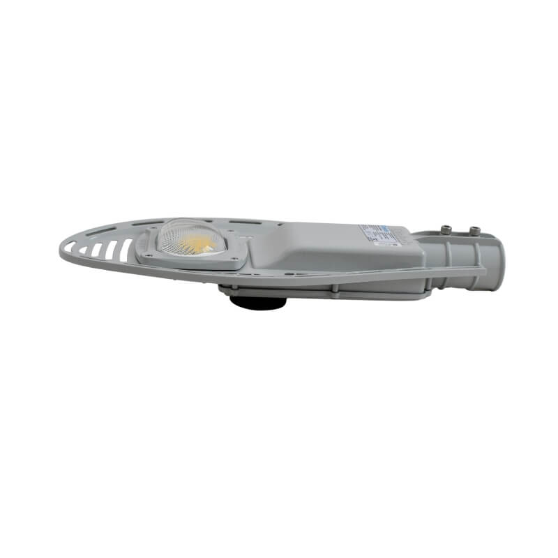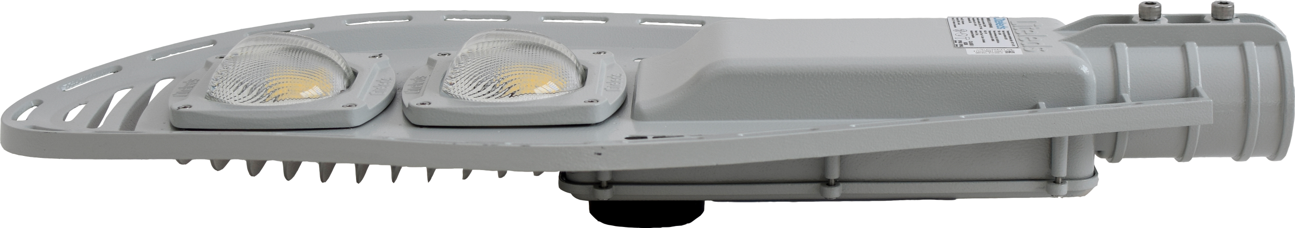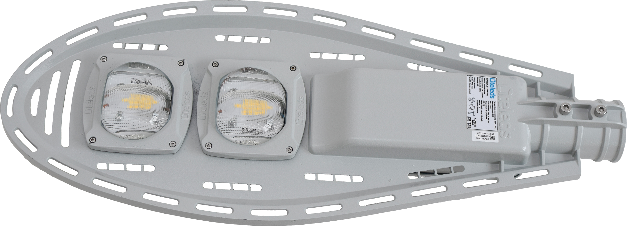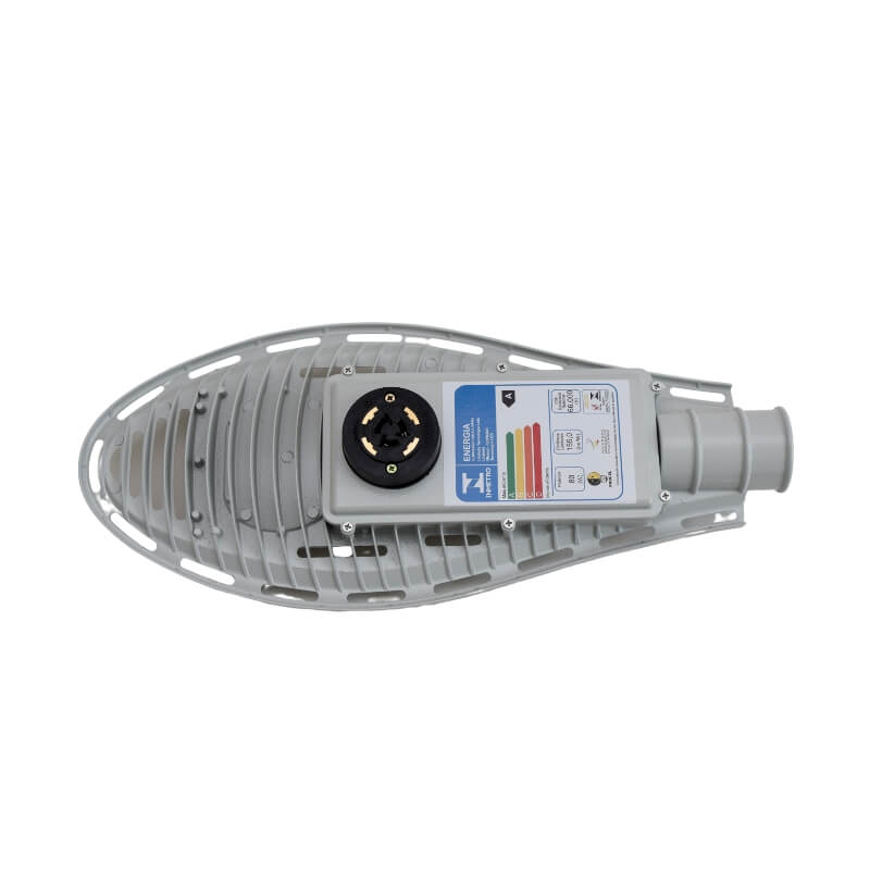 Luminária pública viária tecnologia LED SMD com tomada NEMA 7 ou NEMA 3 preparada para dimerização, corpo com tratamento para raios infravermelhos e ultravioletas com pintura eletrostática anticorrosiva na cor cinza claro (RAL7035) e parafusos em aço inox.