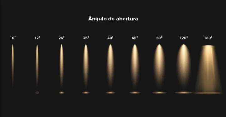 Esse ângulo é medido em graus (°) e influencia diretamente a intensidade, o foco e a cobertura da iluminação. Quanto menor o ângulo, mais concentrado e intenso é o feixe; quanto maior, mais ampla e difusa é a luz.